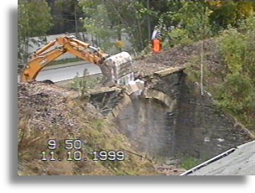 | Am Vormittag des 11.Oktober 1999, gegen 09.50 Uhr, wurde das Brückengewölbe der 1875 errichteten Eisenbahnüberführung im km 3,065 der Strecke Glauchau - Wurzen zum Einsturz gebracht. Alles, was blieb, war ein ansehnlicher Bauschutthaufen. |